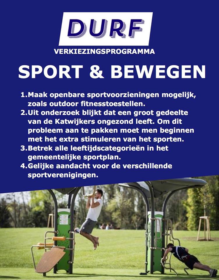 Eerder dit jaar werd bekend dat Katwijk in vergelijking met de rest van Nederland kan worden gezien als een minder gezond dorp. Voor de gemeente moet dit de komende jaren een uitdaging zijn om deze cijfers te verbeteren. Wij vinden dat er in de volgende Sportnota voldoende ruimte moet worden gemaakt voor het faciliteren van openbare sportvoorzieningen.