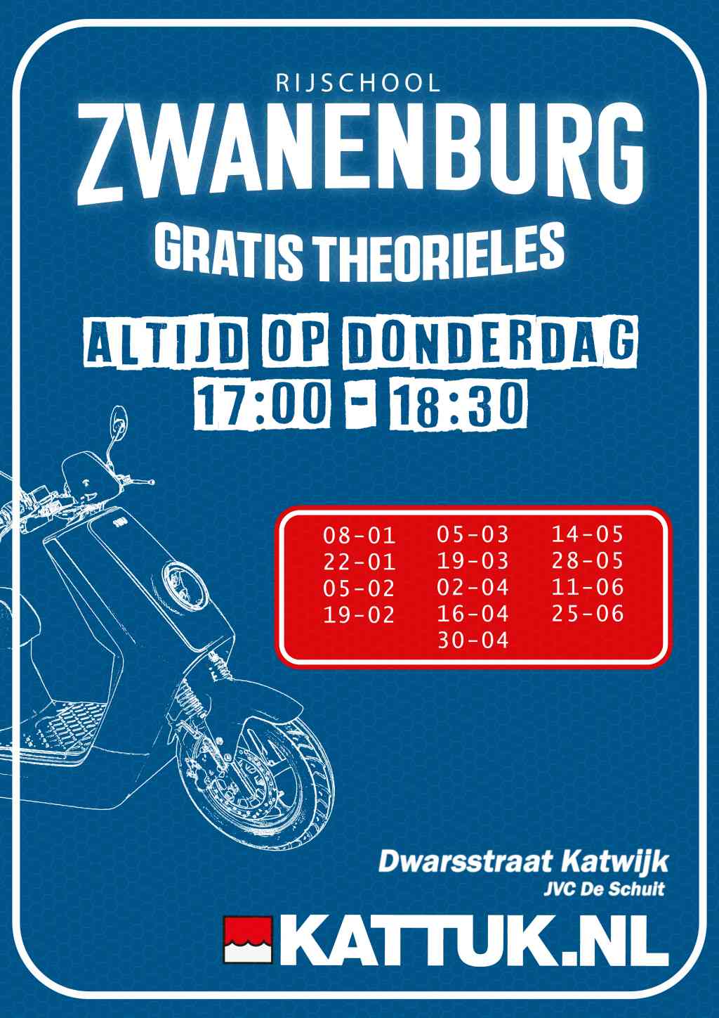 In samenwerking met Kattuk.nl geeft Rijschool Zwanenburg al zo’n acht jaar gratis theorielessen voor brommer, scooter, motor, auto en ieder ander denkbaar voertuig. Twee keer per maand op donderdag ben je van harte welkom om je theorie-examen vast voor te bereiden! Je hoeft je niet aan te melden.