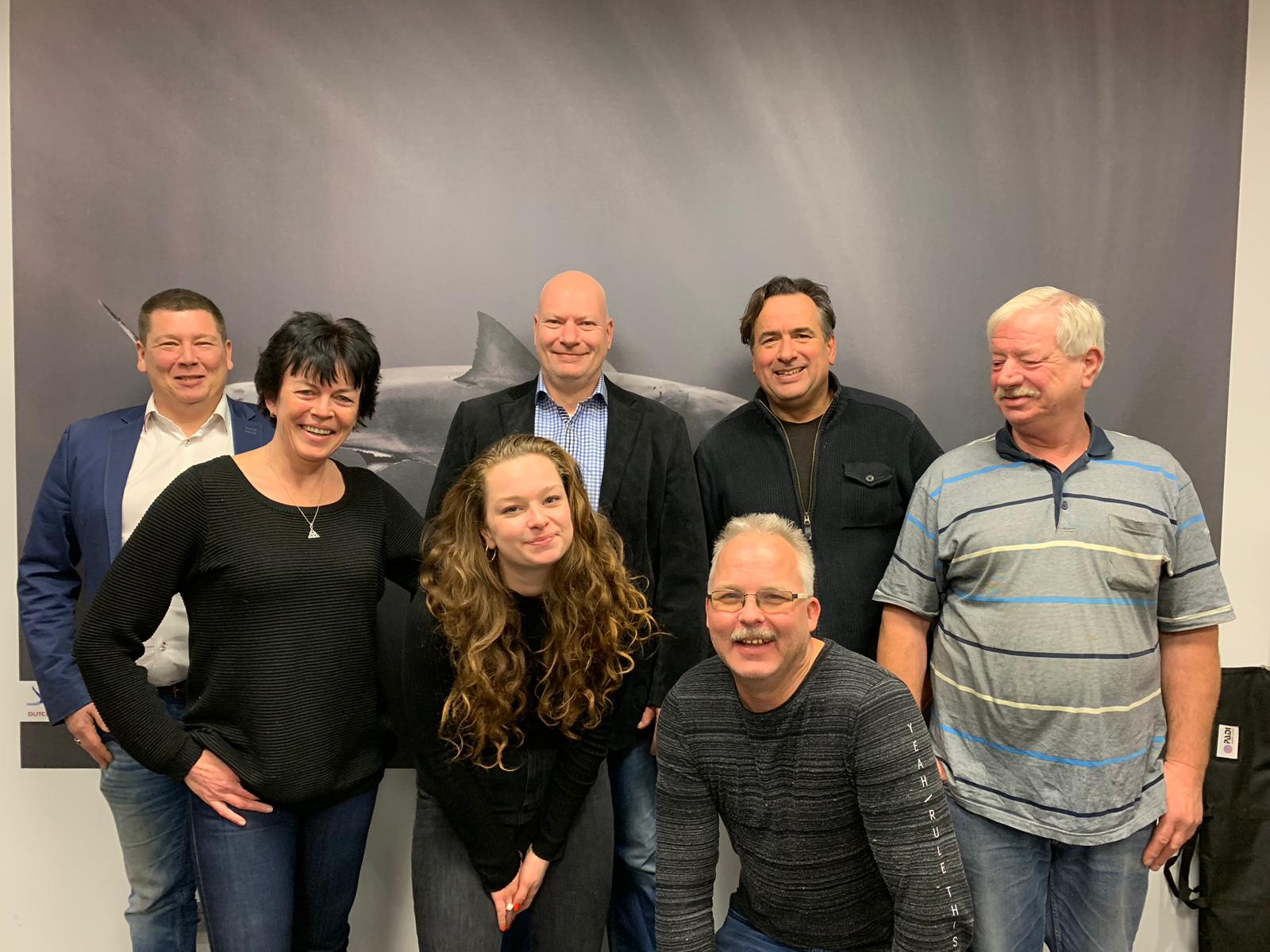 Fotobijschrift: Het huidige en het nieuwe bestuur samen. Van links naar rechts: Ivo van Oerle (nieuw), Linda Smit-van den Berg, Annemarie Barnhoorn (nieuw), Cees Langmuur (nieuw), John Smit, Leen van Velzen (nieuw) en Arie de Vries.