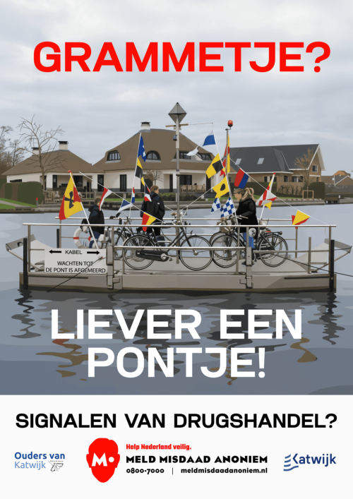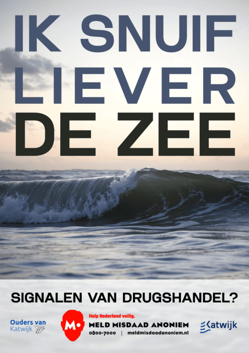 Met deze poster vraagt Katwijk aandacht voor de impact van drugsgebruik. Niet door met de vinger te wijzen, maar met een duidelijke boodschap: drugsgebruik is geen onschuldige keuze. Het tast onze veiligheid aan en ronselt jongeren voor criminele circuits. Liever frisse zeelucht dan een lijntje.