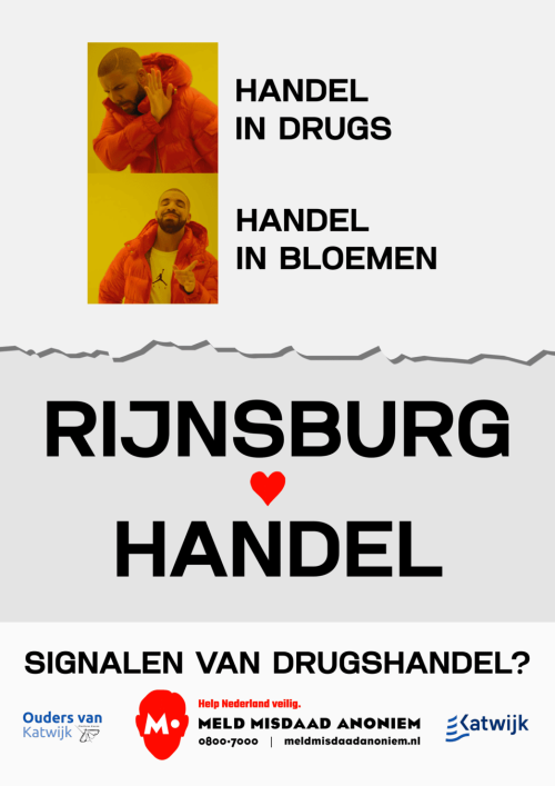 Rijnsburg staat bekend om de bloemenveiling, niet om drugshandel. Deze poster benadrukt de kracht van eerlijke handel. Een knipoog met een serieuze kern: drugshandel hoort niet thuis in onze dorpen.
